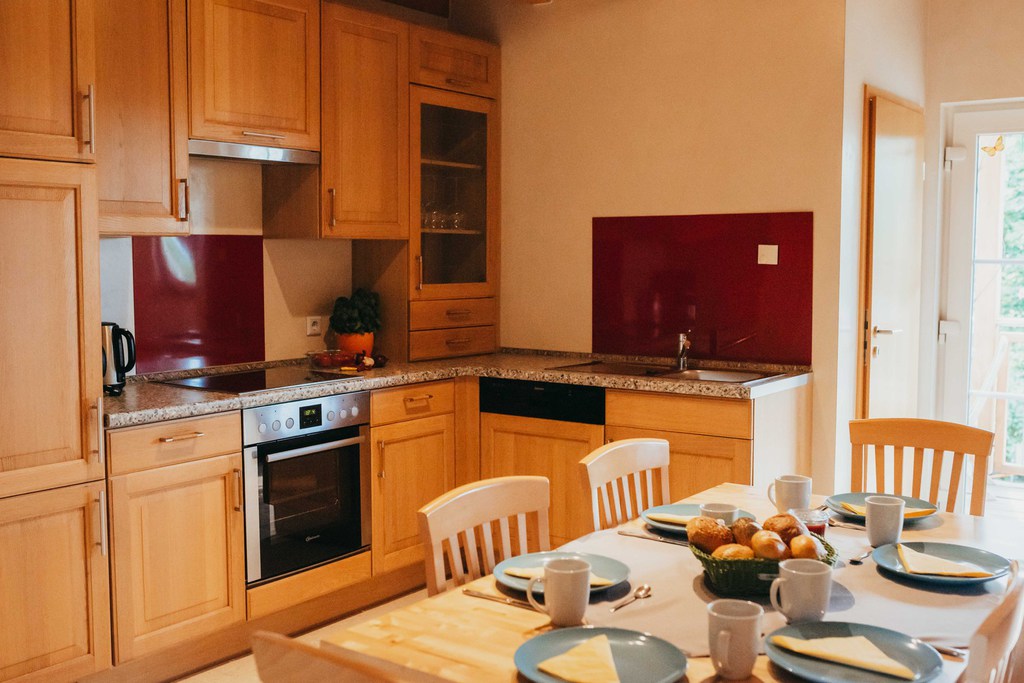 Die Wohnungen verfügen über Geschirr, Besteck, Gläser, Kochgeschirr in entsprechender Menge. Diverse elektrische Küchengeräte wie Kaffeemaschine, Toster, Wasserkocher, Eierkocher, Handmixer, sind vorhanden.