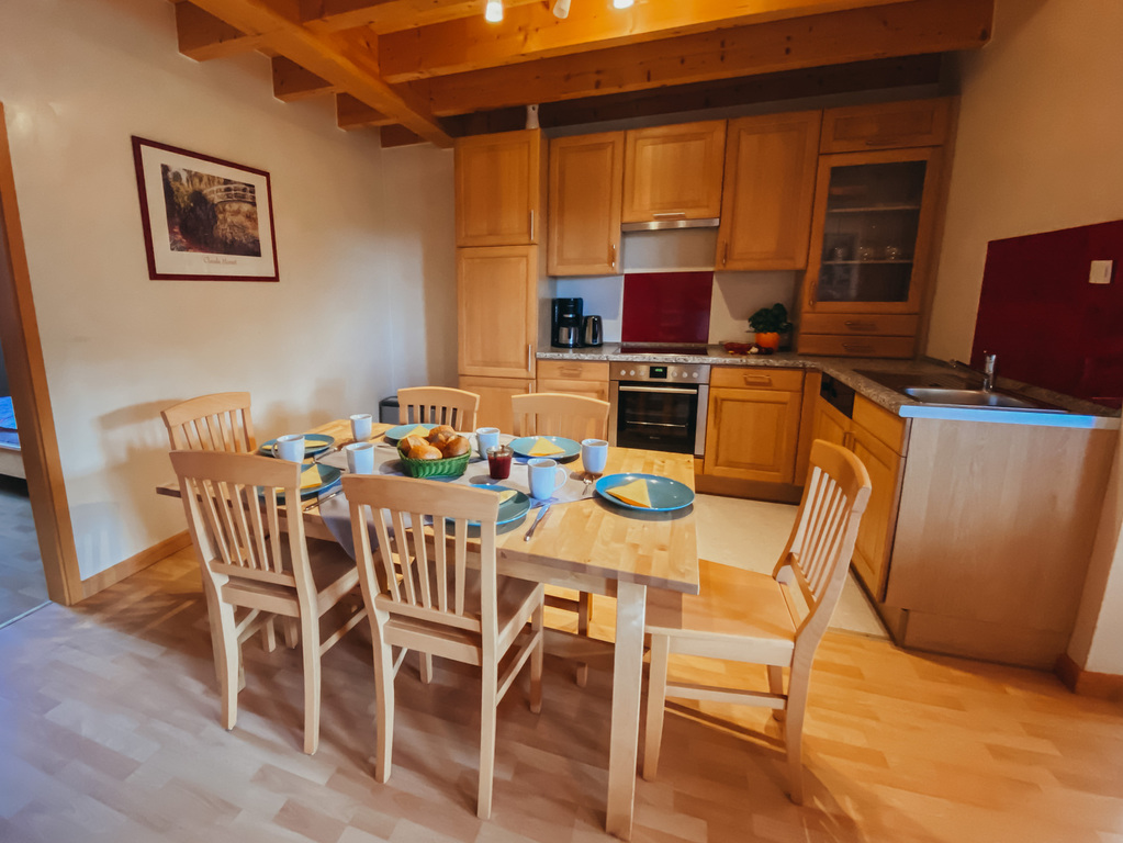 Die Küche ist ausgestattet mit Backofen, Cerankochfeld, Geschirrspüler und Kühlschrank.