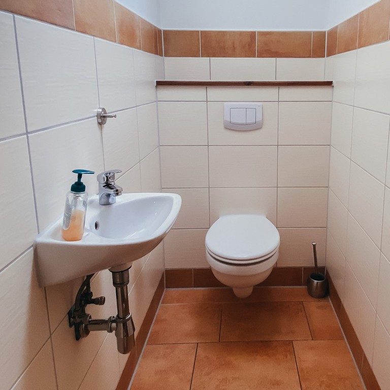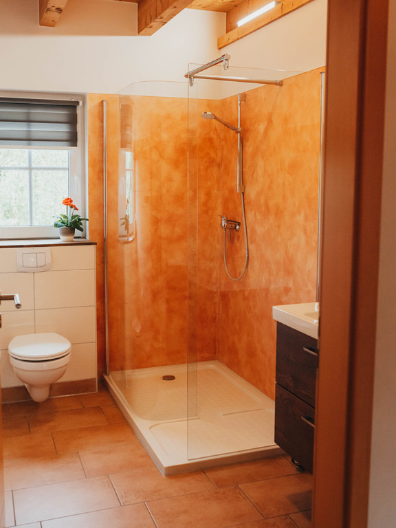 Ein Badezimmer mit begehbarer Dusche und WC, sowie ein separates Gäste-WC ergänzen den Komfort der beiden voll ausgestatteten Wohnungen.