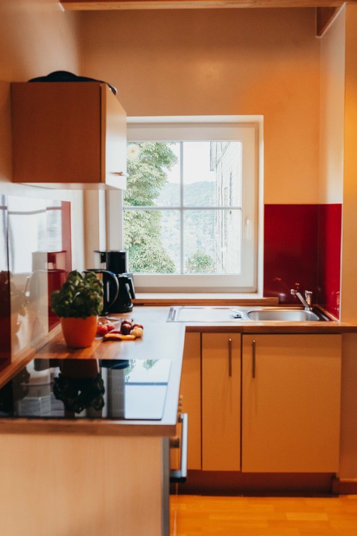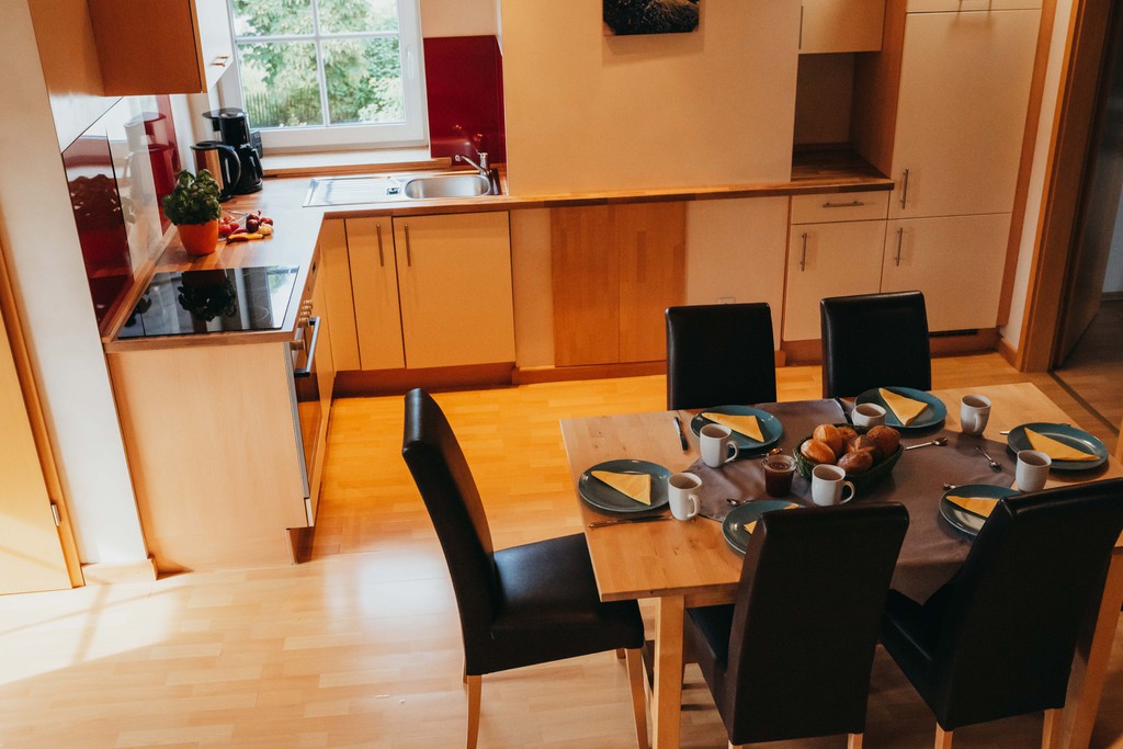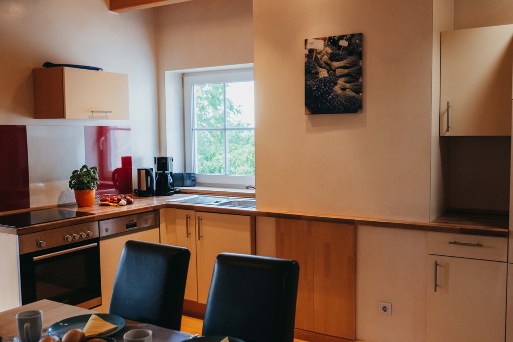 Die Wohnungen verfügen über Geschirr, Besteck, Gläser, Kochgeschirr in entsprechender Menge. Diverse elektrische Küchengeräte wie Kaffeemaschine, Toster, Wasserkocher, Eierkocher, Handmixer, sind vorhanden.
