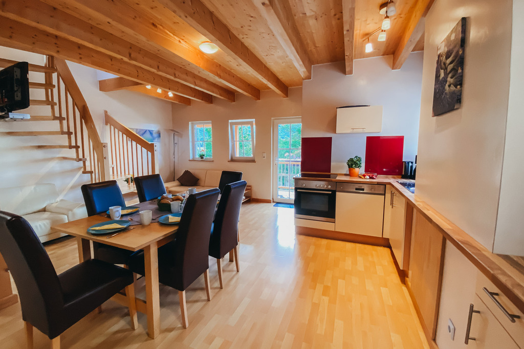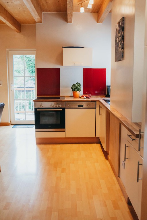 Die Küche ist ausgestattet mit Backofen, Cerankochfeld, Geschirrspüler und Kühlschrank.