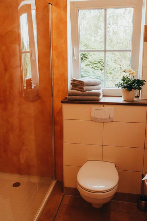 Ein Badezimmer mit begehbarer Dusche und WC, sowie ein separates Gäste-WC ergänzen den Komfort der beiden voll ausgestatteten Wohnungen.